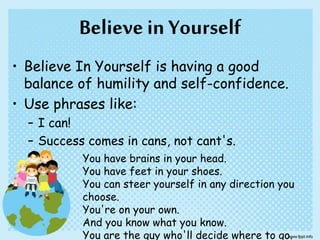 This document discusses several important values including believing in yourself, love, respect, encouragement, character, good manners, caring, sharing, kindness, and using values. It encourages reflection on whether our actions and words hurt others and promotes treating all people with kindness and inclusion. Key messages are that we should believe in ourselves, treat others with respect, show caring and kindness towards all, and reflect on how our behaviors impact others.