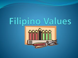 This document discusses values, virtues, and Filipino values. It defines values as broad preferences about right and wrong that influence attitudes and behavior. Values clarification helps people define their own values and understand others'. The document then lists some key Filipino values, including family, politeness, hospitality, gratitude, shame, flexibility, loyalty, hard work, and resignation. It defines virtues as moral habits that help achieve values. Finally, it provides Benjamin Franklin's list of virtues, such as temperance, order, frugality, and humility.