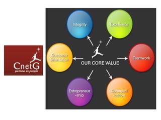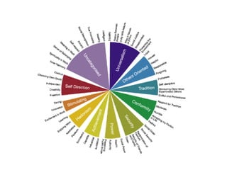 The document discusses values, what they are, how they are formed, and different types of values. It states that personal values are the center of a person's universe and drive their behavior, thoughts, decisions, words, and relationships. Values are formed through inculcation by parents and teachers when young, modeling important people in one's life, self-analysis of life experiences, and rational and emotional examination of one's values. The document outlines core values like integrity and honesty, internal values like freedom and challenge, and external values like friendship and cooperation. It also discusses how businesses like Tata focused on national values over just profit.