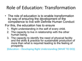 The document outlines the need for and objectives of establishing a Centre for Ethics and Value-Based Education. It discusses that the role of education is to enable transformation by developing competence to live according to human values. It states that current education is not adequately providing this, resulting in tensions in society. The Centre would aim to promote reflection on human values through research, education and training programs. Its objectives would be to develop innovative teaching materials on values, conduct training workshops, and help design ethics-focused curriculum. The Centre's activities would include academic programs on values, establishing an ethics cell, integrating values into courses, and facilitating discussions on professional ethics. The overall goal is holistic transformation of individuals and society through education focused on mutual understanding,