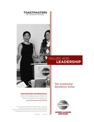 The document summarizes a Toastmasters presentation on values and leadership. It discusses how values guide individual and organizational behavior and decision-making. Successful leaders understand their own values as well as those of their team to ensure alignment and achieve goals. The presentation outline provides guidance on defining values, demonstrating values through words and actions, and aligning an organization's values for effective leadership. It concludes that leaders who consistently adhere to a set of values will earn respect and inspire their team.