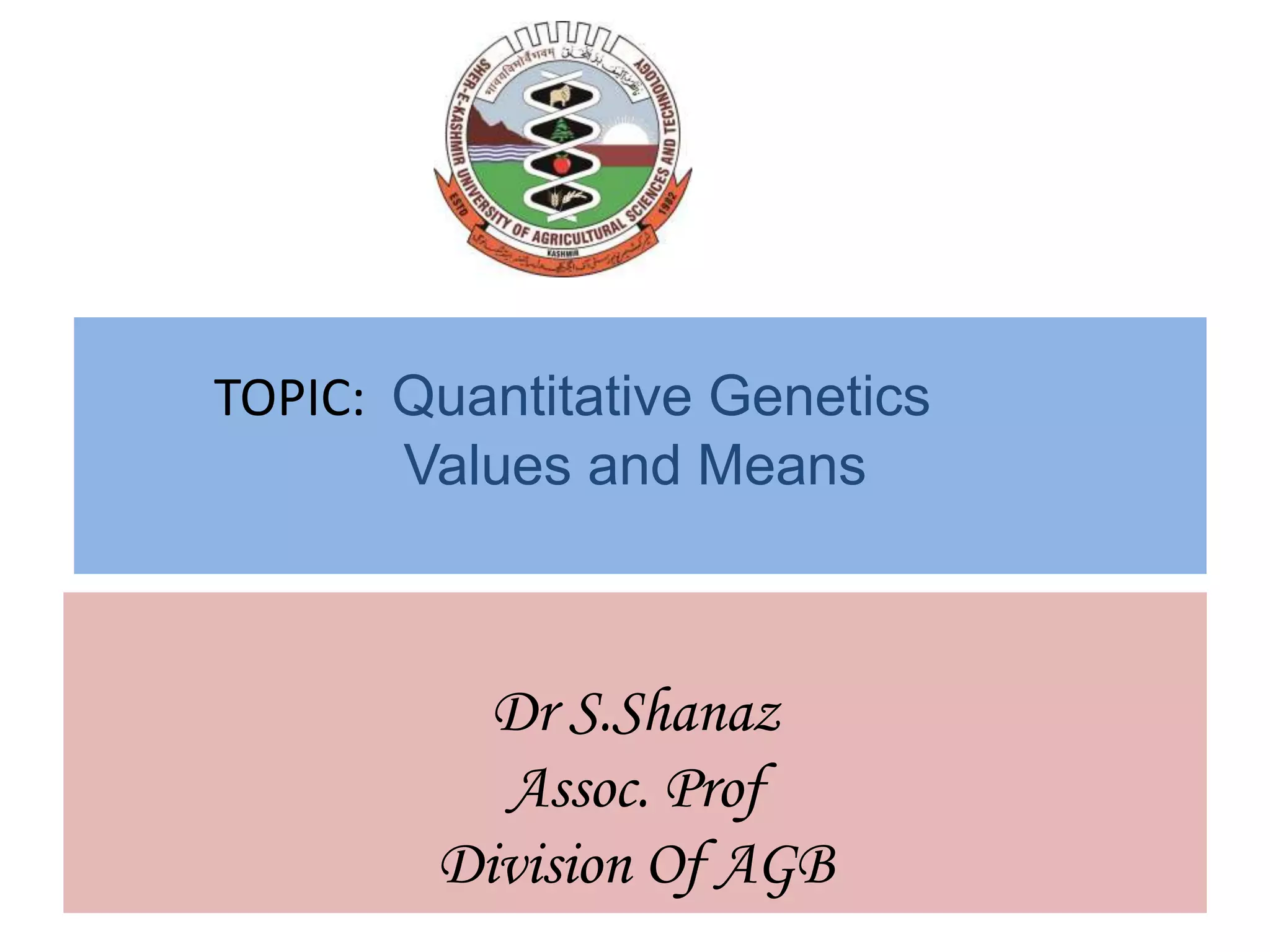 This document discusses quantitative genetics and the concepts of phenotypic value, genotypic value, environmental deviation, and population mean. It explains that quantitative traits are controlled by multiple genes and their inheritance is called quantitative or polygenic inheritance. The phenotypic value of an individual is determined by the sum of their genotypic value and environmental deviation. The population mean genotypic value, which is equal to the population mean phenotypic value if environmental deviations average to zero, can be calculated based on allele frequencies at loci and their additive and dominance effects.