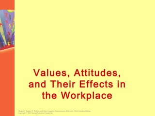 This document discusses values, attitudes, and their effects in the workplace. It defines values and attitudes, examines how they differ across cultures, and influence behavior. Values reflect deep convictions about what is important, contain judgments of right and wrong, and generally guide attitudes and behavior. Attitudes are feelings toward objects, people, or events and are less stable than values. The document also explores cognitive dissonance and how individuals seek to reduce inconsistencies between attitudes and behaviors.