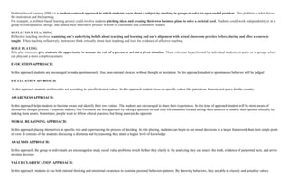 The document provides an overview of various values education approaches, including inculcation, moral development, analysis, values clarification, and cognitive developmental approaches, each with distinct purposes and methods. It highlights methods such as modeling, structured discussions, role-playing, and problem-based learning to engage students in understanding and developing their values. The focus ranges from instilling specific values to fostering complex moral reasoning and self-awareness in students, ultimately aiming for a deeper comprehension of personal and social ethical frameworks.