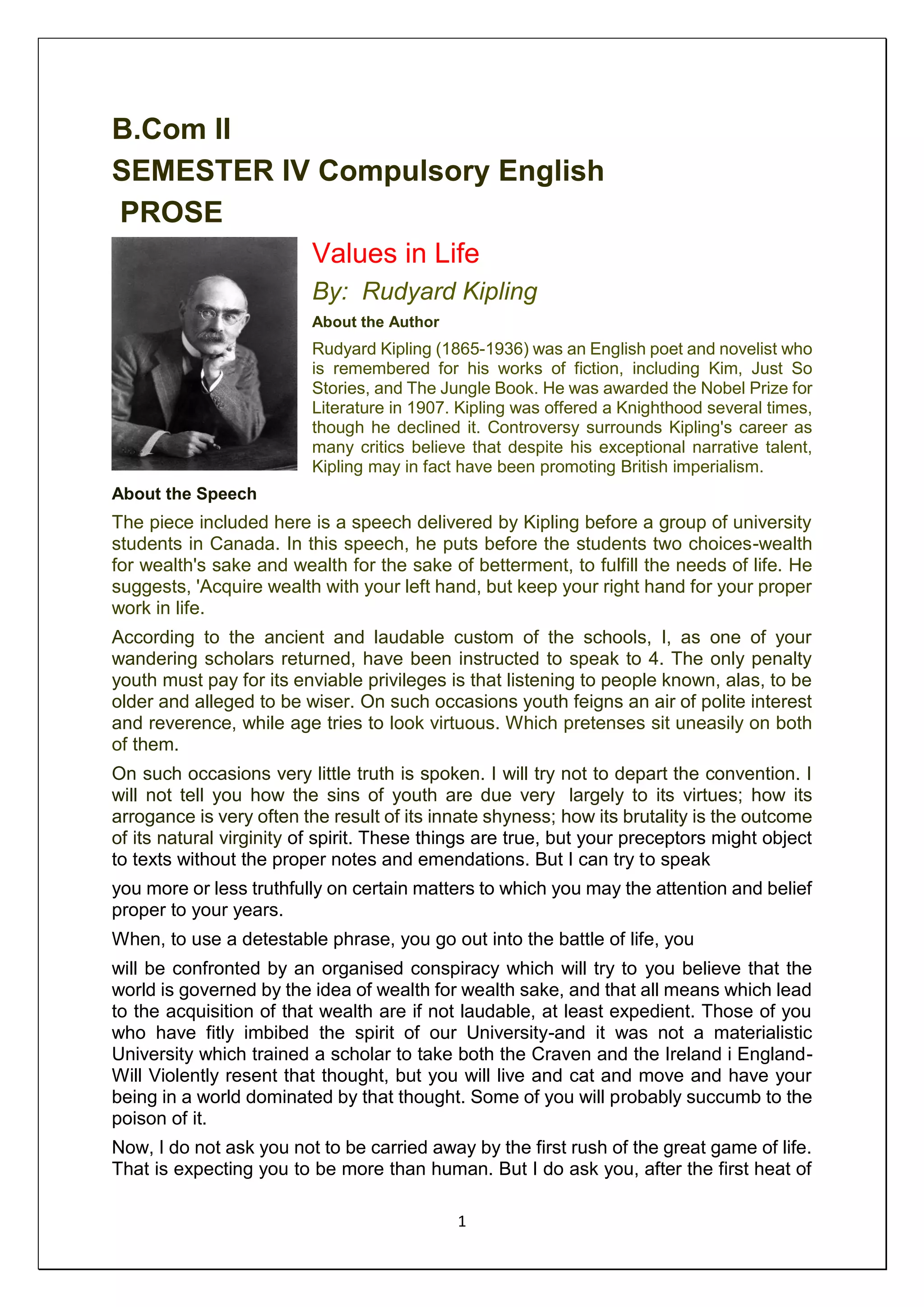 Rudyard Kipling delivers a speech to university students in which he warns against pursuing wealth for wealth's sake alone. He advocates acquiring enough wealth to fulfill life's needs with one hand while keeping the other hand free for one's true work. Kipling also discusses the depression experienced by youth and encourages focusing on issues beyond oneself to overcome dark periods.