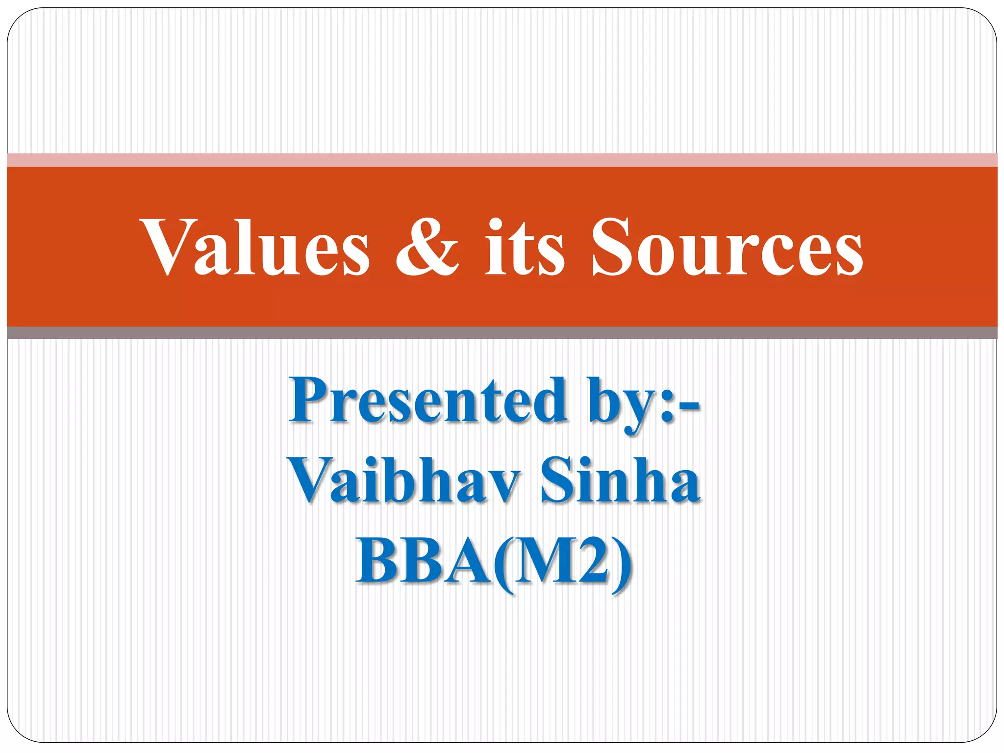 The document discusses the definition and sources of values. It defines values as convictions that form an individual's framework for judging what is good, bad, desirable, or undesirable. There are four main sources of values formation: social institutions like family and school that reward good behavior and punish bad behavior; organizational values that guide an organization's actions and culture; peers and colleagues whose norms individuals try to follow; and work and career, which create values that give meaning and cohesion to work groups in different fields. Each of these sources helps shape an individual's principles and standards of behavior.