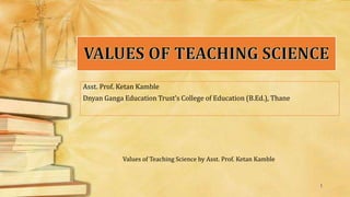 The document discusses the values of teaching science according to Assistant Professor Ketan Kamble. It identifies 10 key values: 1) Intellectual values like developing problem solving skills. 2) Utilitarian/practical values as science is used in daily life. 3) Disciplinary values such as developing qualities like cleanliness and concentration through experimentation. 4) Moral values such as honesty and consideration are developed through scientific experiments and research. 5) Social values since science is learned socially and helps society progress through knowledge sharing.