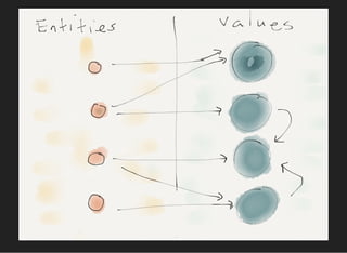 The document discusses the concept of object-oriented programming in Ruby, particularly focusing on the use of value objects and their advantages, such as immutability and enhanced reasoning. It includes examples of defining classes, handling attributes, and implementing identity vs. value in objects, as well as methods for managing names and credit card numbers. Additionally, it covers practices for improving software design by segregating domain logic from application code.