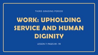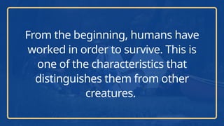 The document discusses the significance of work in human life, emphasizing that it is a privilege and responsibility that contributes to self-development, fulfillment, and community service. It highlights the moral obligation to work diligently and develop talents while also serving others, especially during challenging times. The text encourages personal and social responsibility in work, conveying that it not only improves individual lives but also benefits families and communities.