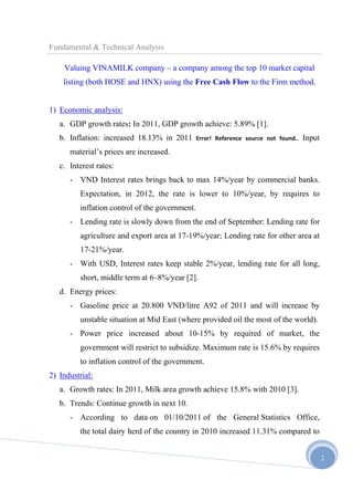 This document provides an analysis of Vinamilk, a leading dairy company in Vietnam, using the free cash flow to firm valuation method. It summarizes Vinamilk's financial performance from 2007-2011, noting steady revenue growth over 26% annually and equity increasing nearly 3 times from 2008-2011. The analysis also reviews Vietnam's economic conditions, the dairy industry and market trends, Vinamilk's products/brands, management, distribution network, and competition in the market. Vinamilk has the largest market share in fresh milk, yogurt, and condensed milk in Vietnam.