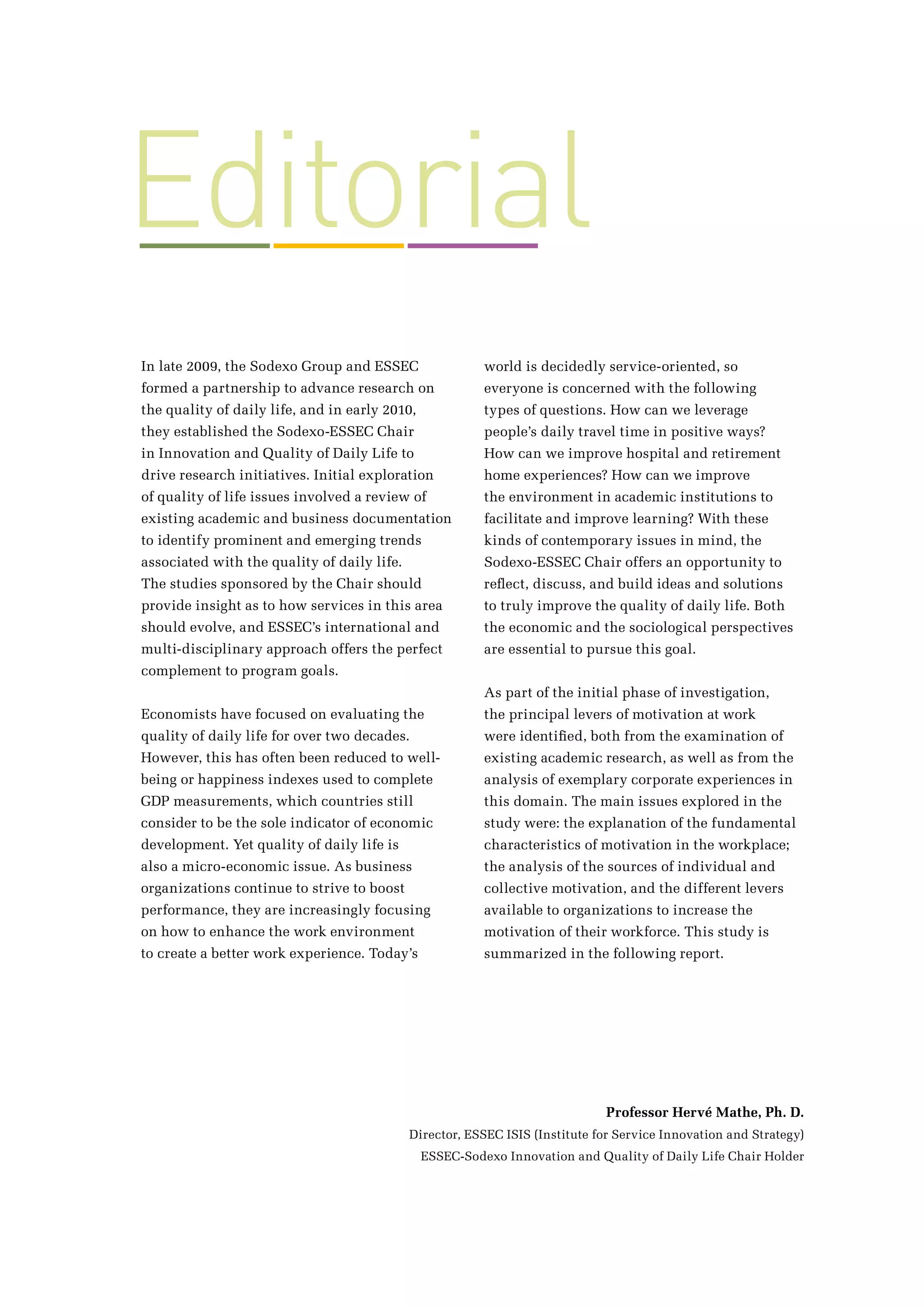 This document summarizes a study on motivating employees in the workplace. It identifies 9 key levers for motivation grouped into 3 categories: live, grow, and connect. The live category includes work environment, working conditions, and work-life balance. The grow category covers career development, recognition, and responsibility. The connect category comprises team spirit and corporate culture/values. The study provides an innovative model for organizations to leverage these motivation factors to inspire long-term employee engagement and boost business performance.