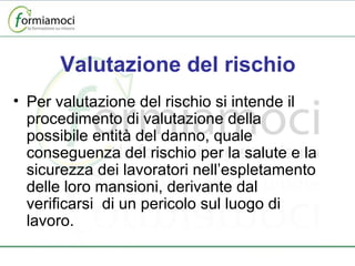 Il decreto legislativo 81/08 stabilisce il procedimento di valutazione dei rischi per la salute e la sicurezza dei lavoratori, orientato a identificare e mitigare i pericoli presenti nel luogo di lavoro. La valutazione del rischio comprende l'identificazione dei pericoli, la calcolo del rischio residuo e la pianificazione delle misure preventive, coinvolgendo anche figure come il RSPP e il medico competente. L'obiettivo finale è garantire il miglioramento dei livelli di sicurezza attraverso un monitoraggio continuo e l'adozione di misure efficaci.