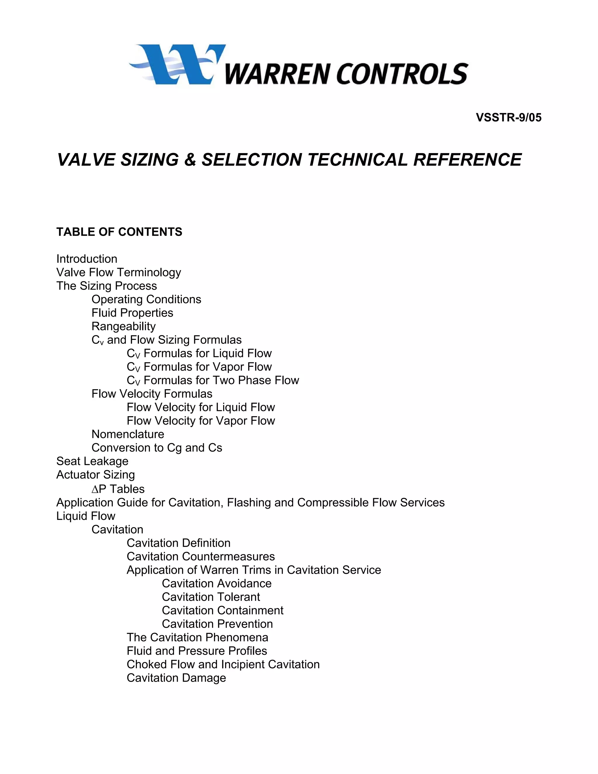 This document provides an overview of valve sizing and selection. It defines key terms like CV, FL, rangeability, cavitation, flashing, and compressible flow. It describes the sizing process which involves determining the required CV based on operating conditions and fluid properties, then selecting a valve with a rated CV that meets or exceeds the required CV. It also discusses how to address issues like cavitation, flashing, high velocities, and noise that may impact valve selection. Formulas are provided for calculating CV for liquid, gas, vapor and two-phase flow. Guidelines are given for selecting valves for applications involving cavitation, flashing, compressible flow or high velocities.