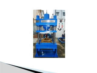 The document describes a valve test rig used for pressure testing various types of valves, including butterfly and check valves up to 12 inches. It outlines the components of the rig, such as the hydraulic press bed, power pack, controller, and camera, as well as system specifications like motor power and pressure range. The rig facilitates processes like leak testing and hydrostatic pressure testing.