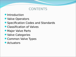 This document provides an overview of valves, including their main components and classifications. It discusses how valves control fluid flow through opening, closing, or regulating pathways. Valves are classified based on their motion and size. Major valve parts include pressure-retaining components like the body and bonnet, as well as non-pressure parts like seats and stems. Different stem designs are used depending on the valve type and size. Standards provide guidelines for valve specification, design, and testing.