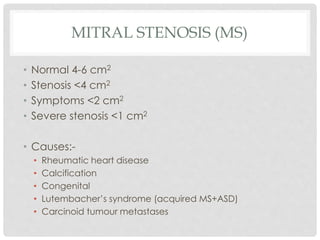 1. Mitral stenosis causes narrowing of the mitral valve and leads to left atrial and pulmonary hypertension. Symptoms include dyspnea and right heart failure.