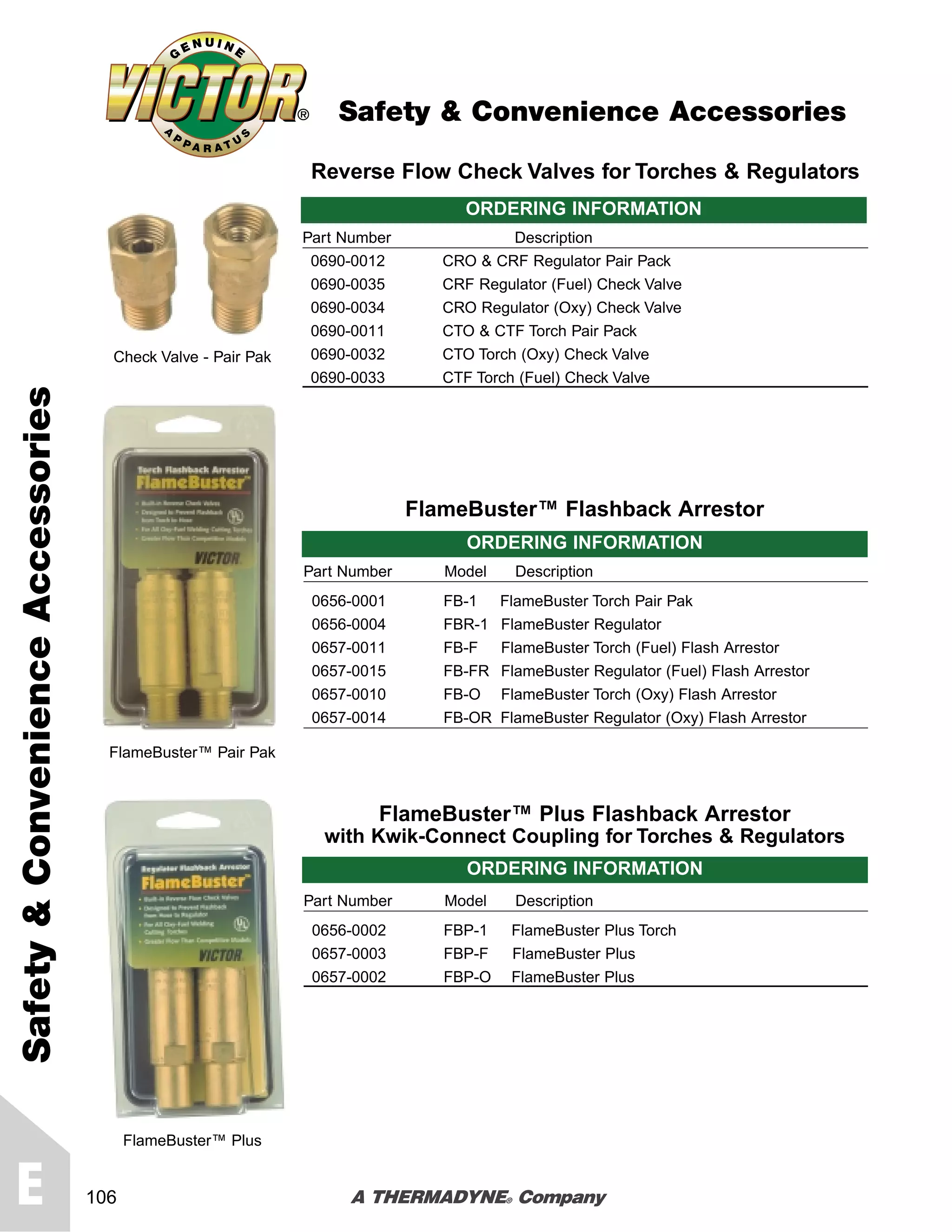 This document provides ordering information for various flashback arrestors and related accessories for oxy-fuel cutting torches and regulators. It includes part numbers, models, and brief descriptions. Safety accessories include flashback arrestors for torch pairs, individual torches, and regulators. Flashback arrestors are available in standard and "Plus" models, and some have optional Kwik-Connect couplings. Replacement cartridges and kits are also listed to retrofit built-in flashback arrestors for certain torch models. Diagrams illustrate the components and functions of typical flashback arrestors.
