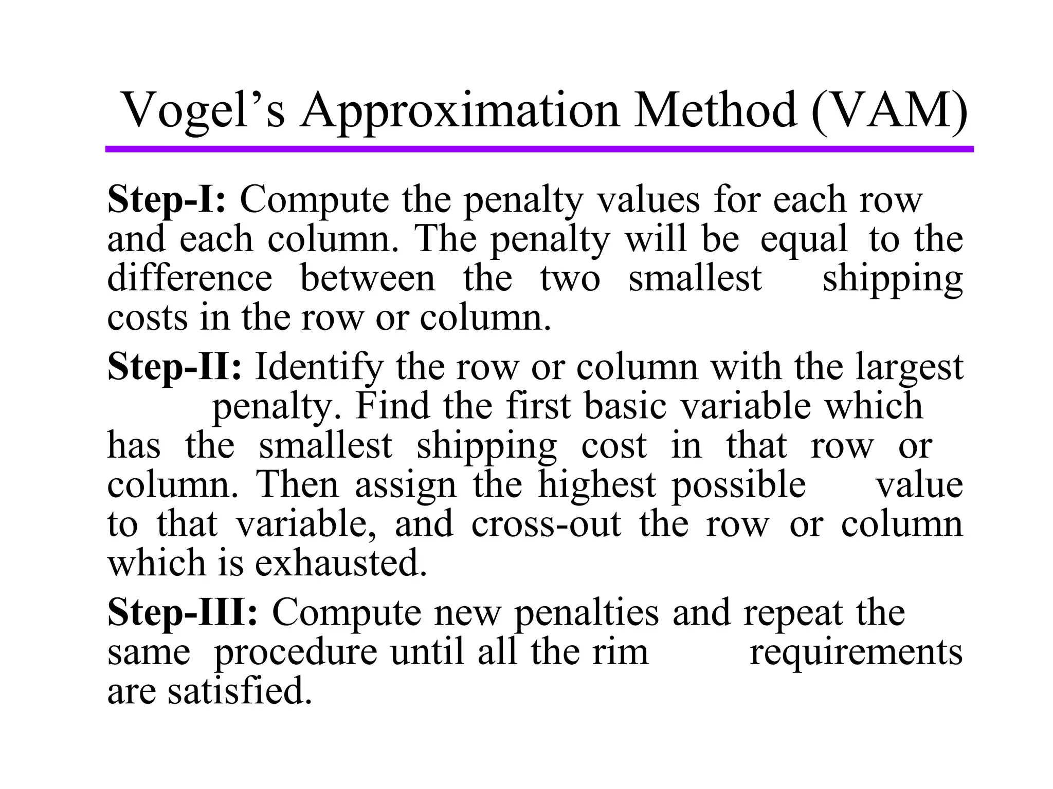 Vogel's Approximation Method (VAM) is a 3 step process for solving transportation problems: 1) Compute penalties for each row and column based on smallest costs. 2) Identify largest penalty and assign lowest cost variable the highest possible value, crossing out exhausted row or column. 3) Recalculate penalties and repeat until all requirements are satisfied.