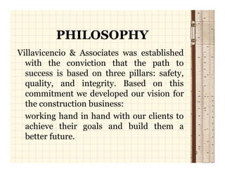 Villavicencio & Associates is a Puerto Rican construction company founded on principles of safety, quality, and integrity. The company works to achieve clients' goals and build a better future through partnership. It has a balanced workforce with experienced professionals and dedicated young people. Villavicencio & Associates operates across six major sectors and has completed projects in pharmaceutical, institutional, governmental, residential, commercial, and industrial construction. Current projects include work for the University of Puerto Rico, the San Juan Steam Plant, and the expansion of the San Jorge Children's Hospital.