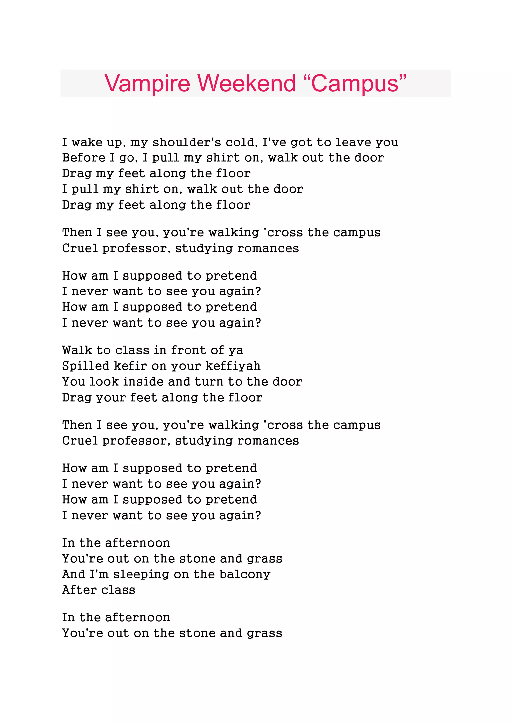 The song describes a narrator who wakes up after spending the night with a romantic interest. As they leave and go about their day on campus, they see their interest walking across campus and attending class, which makes it difficult to pretend they don't want to continue seeing them. In the afternoons, while their interest is outside on the campus grounds, the narrator naps on a balcony after their own classes are over.
