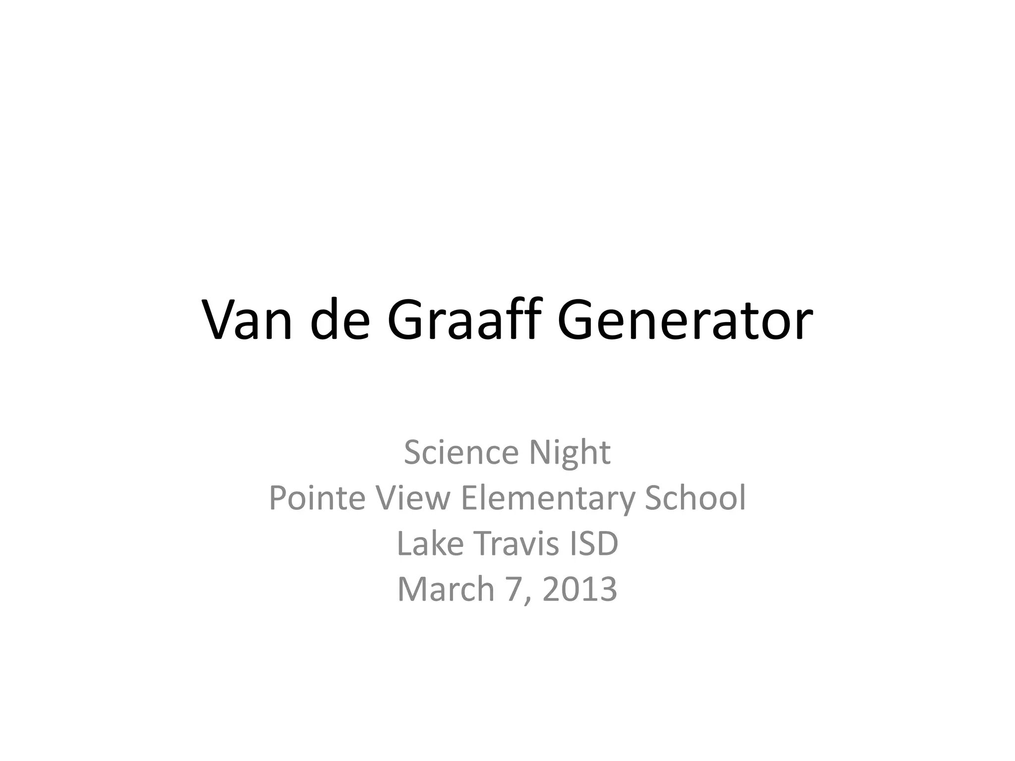 This document discusses a presentation about a Van de Graaff generator being demonstrated at Pointe View Elementary School's Science Night. It provides background information on Van de Graaff generators, including a schematic, descriptions of large generators at MIT and Rice University, and their use in physics research and accelerators. It also briefly covers static electricity and Benjamin Franklin's contributions to the understanding of electricity.