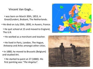 Vincent Van Gogh (1853-1890) was a Dutch post-impressionist painter known for his vivid use of color. He lived in various European cities and started painting seriously in his late 20s. Van Gogh struggled with mental illness and poverty throughout his life. Some of his most famous paintings include The Starry Night, Sunflowers, and his multiple self-portraits. He sold only one painting during his lifetime and died by suicide at age 37 in Auvers, France.