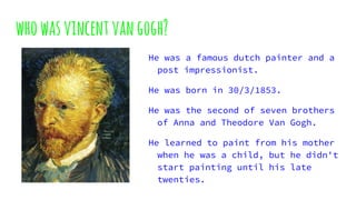 Vincent Van Gogh was a famous Dutch post-impressionist painter born in 1853 who taught himself to paint as a child. He had a difficult life and career, producing over 2,100 artworks but only selling one painting during his lifetime. He struggled with mental illness and cut off his own ear during a fight with fellow artist Paul Gauguin. Van Gogh is now considered one of the most influential artists in history and some of his paintings, like The Starry Night, are among the most expensive in the world.