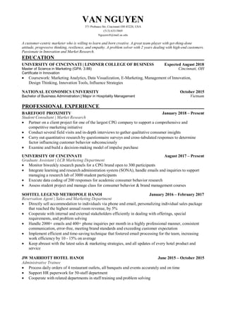 Van Nguyen is an aspiring marketer with a Master's degree in Marketing from the University of Cincinnati and extensive experience in market research and customer service. With a strong focus on innovation and consumer behavior, he has held roles ranging from student consultant to reservation agent in high-end hospitality settings. Fluent in English and Vietnamese, he has also been recognized for his academic and extracurricular achievements.