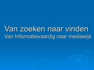 Hoe diep zoekenwe? Het diepe Web Informatie zit in databases Zoekmachine limiteringen Dynamische pagina’s Zoekformulieren Grafische of multimediale bestanden Ingewikkelde sites Grote files Limiteringen van zoekers Niet verder kijken dan pagina 2 of 3 van resultaten http://wowter.pbwiki.com/Hoe-diep-zoeken-we