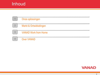 Onderdeel van deVANAD Group VANAD is onderdeel van de VANAD Group Gebaseerd op de visie van Ad Nederlof, voormalig President & CEO van Genesys; Vindt haar oorsprong in 1983; Moederbedrijf van verschillende ondernemingen; Focus op Customer Interaction Management en IT (waaronder Software as a Service (SaaS) en professional services); 40 miljoen (EUR) omzet in 2009; Volledig gefinancierd met eigen kapitaal; Meer dan 400% groei in de laatste 3 jaar; Actief over de hele wereld met meer dan 10 vestigingen; Biedt werk aan meer dan 1.000 mensen.