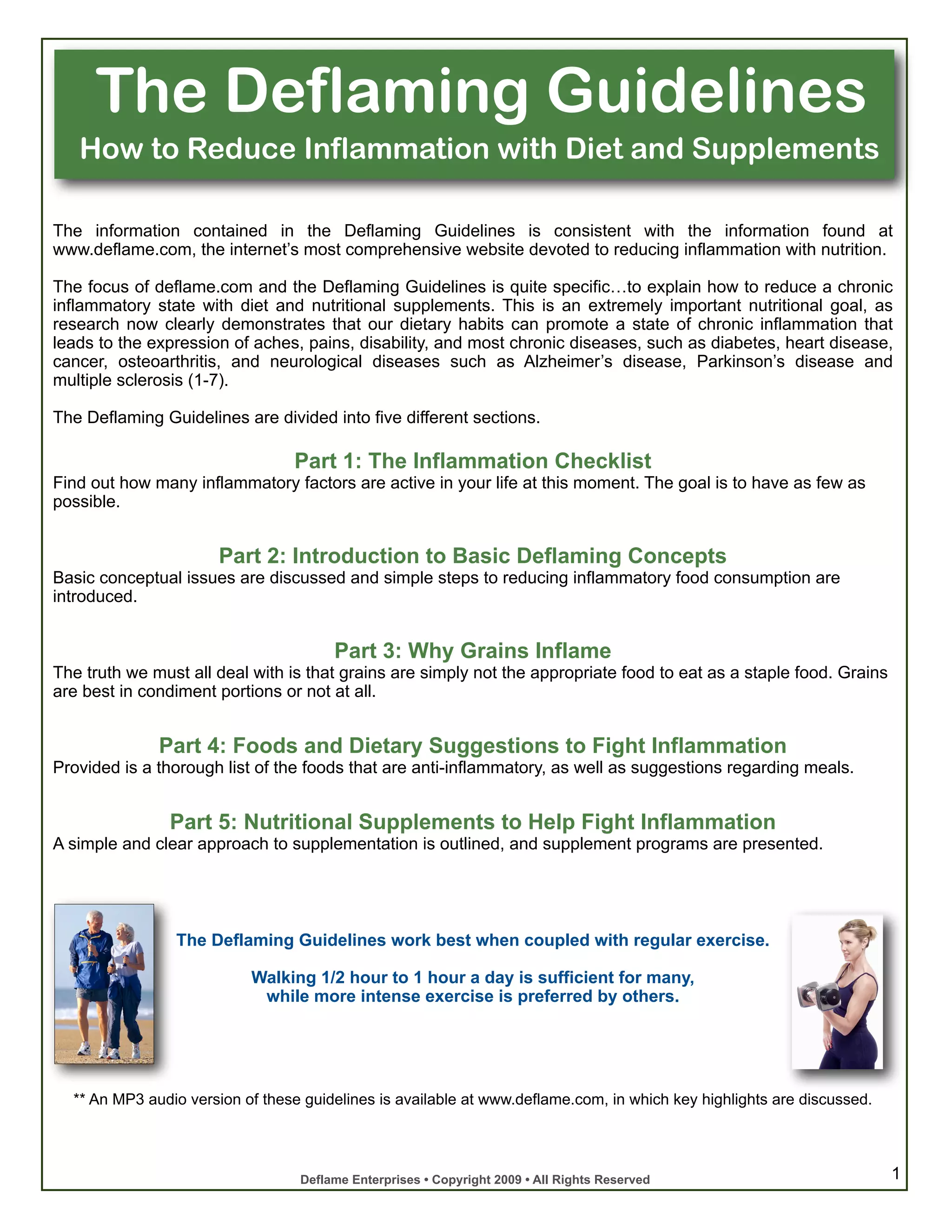 The Deflaming Guidelines provide strategies to reduce chronic inflammation through dietary changes and supplements, emphasizing the avoidance of grains, refined sugars, and unhealthy fats. The guidelines are structured into sections that include an inflammation checklist, basic concepts of deflaming, a detailed explanation of the inflammatory effects of grains, and recommendations for anti-inflammatory foods and supplements. Regular exercise is also highlighted as a complementary approach to achieving the best results in reducing inflammation.