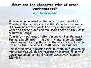 Vancouver is located on the west coast of Canada, surrounded by water on three sides and mountains. It has a temperate climate and is one of the most livable cities in the world. Vancouver has a population of over 2 million people in its metro area and is a multicultural society with many immigrants, especially from Asia. The economy is growing, focused on industries like technology, tourism, finance, and natural resources.