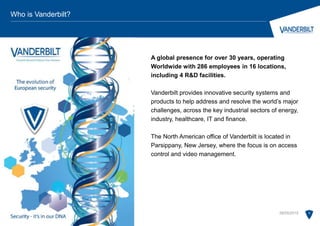 Vanderbilt is an independent security business with over 30 years of global presence, specializing in innovative security systems across various industries such as energy, healthcare, and finance. It focuses on access control, video management, and intrusion alarm systems, operating 16 locations worldwide, with its North American office in New Jersey. Vanderbilt aims to be the largest independent security products provider and prioritizes customer relationships through a multi-channel market approach, emphasizing agility, flexibility, and comprehensive technical support.