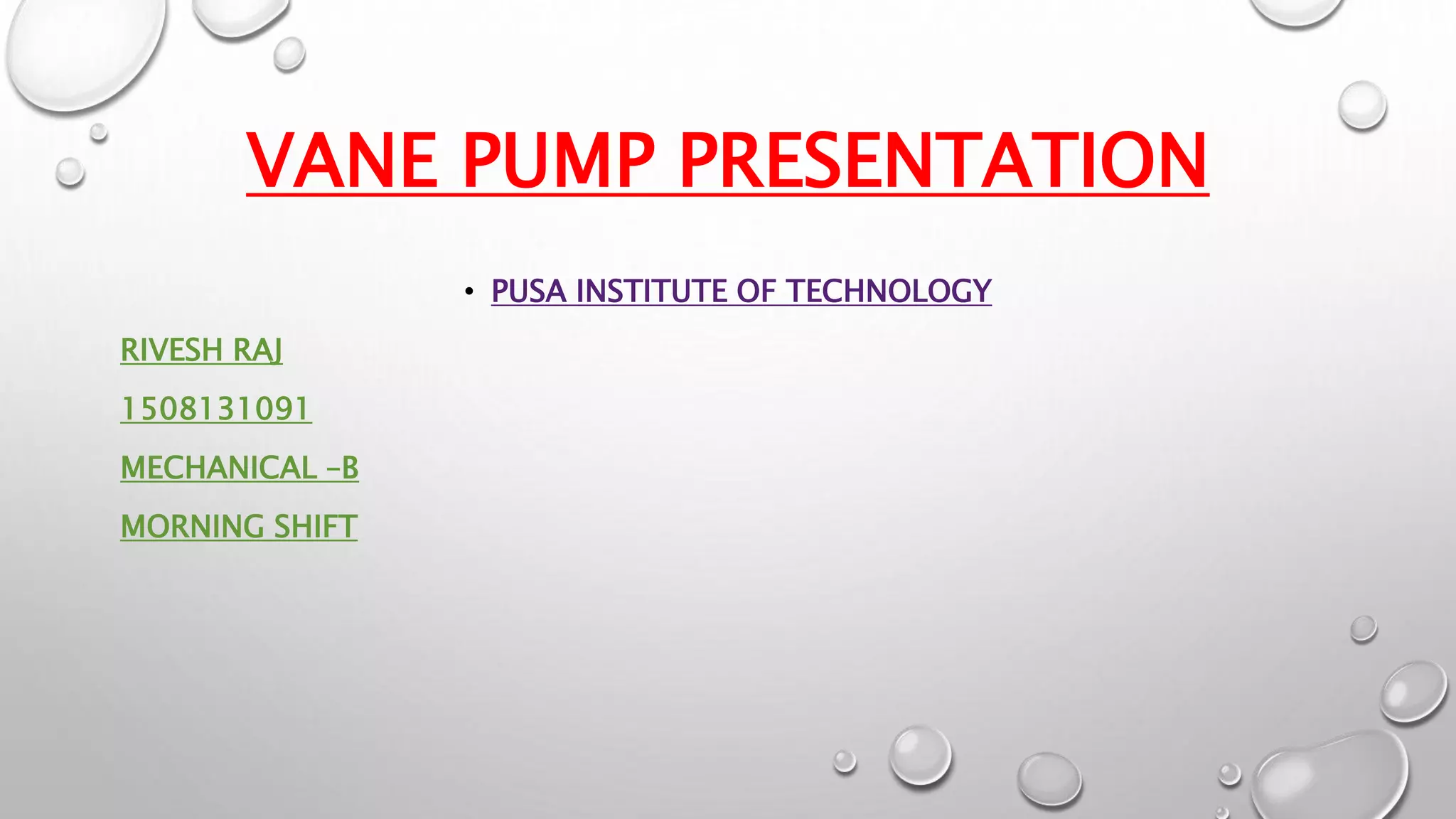 This presentation discusses vane pumps. A vane pump is a positive displacement rotary pump that uses sliding vanes mounted on a rotor to pump fluids. As the rotor turns, the vanes slide in and out to create sealed chambers that draw fluid in during intake and push it out during discharge. Vane pumps can be single, double, or triple vane and are used to pump thin liquids and gases at moderate pressures in various industrial applications such as aerosols, aviation fuel transfer, auto fuels and lubricants, LPG transfer, refrigerants, solvents, and aqueous solutions.