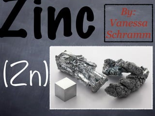 Zinc is a transition metal with an atomic number of 30. It was discovered in 1746 by German chemist Andreas Marggraf through an experiment where he heated zinc ore with charcoal. Zinc has a melting point of 419.58°C and is used in galvanization to prevent rust, in zinc-air batteries, and makes up 97.5% of the U.S. penny. The human body contains around 1.5 grams of zinc which is essential for cell growth, wound healing, and protein synthesis. Common sources of dietary zinc include meat, cheese, and flour.