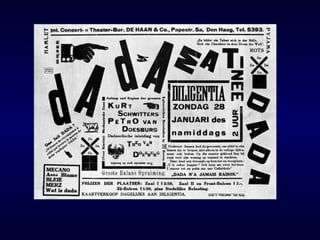 Dadaísmo El dadaísmofoi un movemento artístico xurdido en Europa e en Norteamérica. Apareceu en Zúrich , Suiza entre 1916 y 1922 con Tristan Tzara como su fundador. o poema dadaísta acostuma se unha sucesión de palabras e sons, o que fai difícil encontrarlle lóxica . Distínguese pola inclinación cara o incierto, o nihilismo e o absurdo. Pola súa parte, o procedimiento dadaísta busca renovar a expresión mediante o emprego de materiais inusuais, ou manexando planos de pensamentos antes non mesturables e ten unha tónica xeral de rebeldía ou destrución.