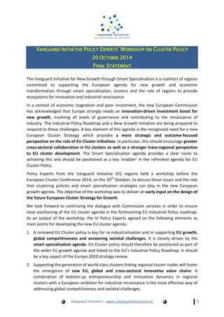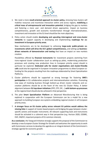 The Vanguard Initiative aims to advance economic growth and industrial renaissance in Europe through a new cluster policy and smart specialization strategies. A recent workshop emphasized the importance of cross-sector collaboration, innovative value chains, and result-oriented approaches to promote competitiveness, investment, and market access for SMEs. The initiative supports the development of interregional networks and public-private co-investments to enhance the EU's global competitiveness and integrate regional clusters into the broader European growth agenda.
