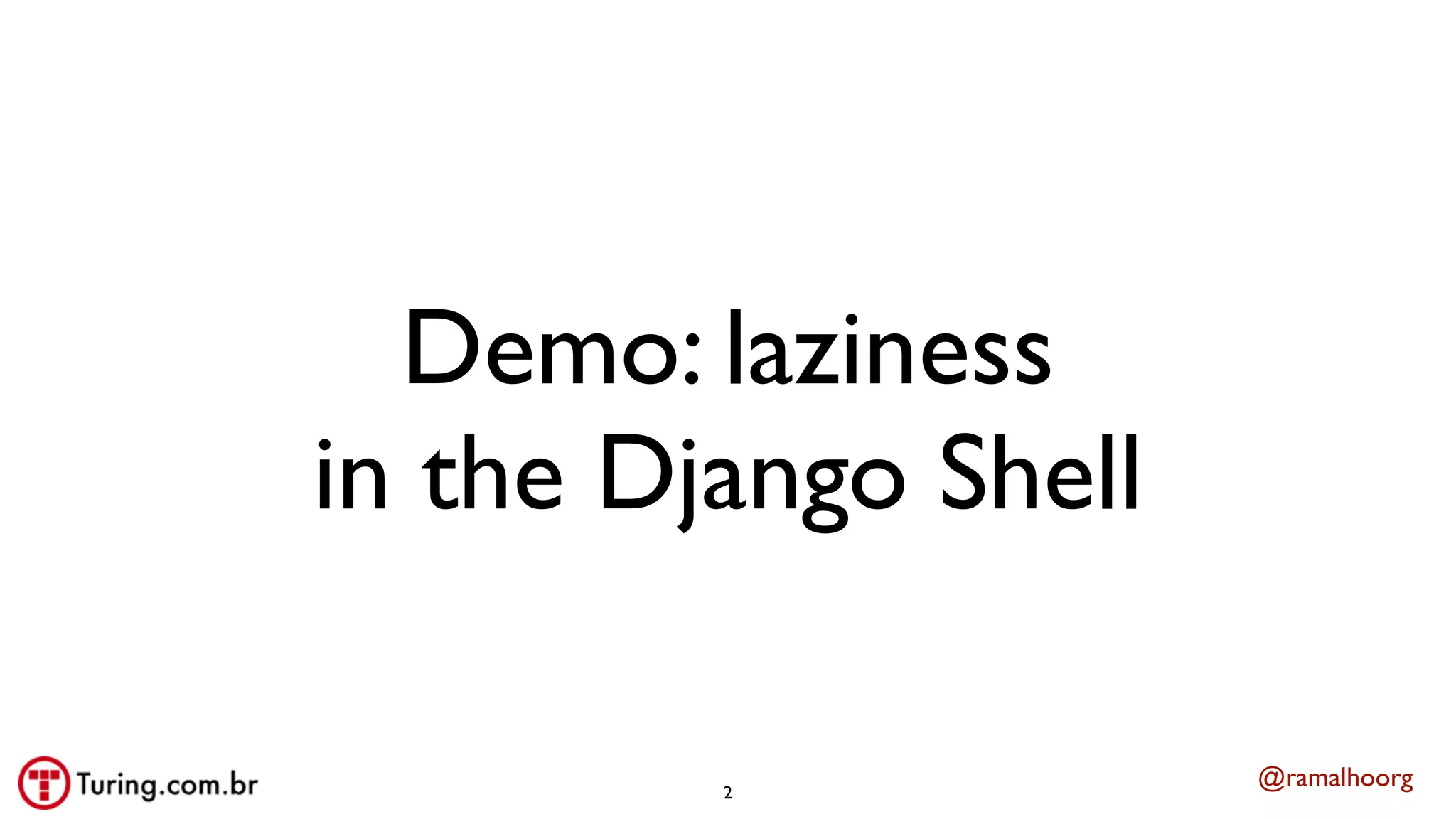 This document discusses iterators and generators in Python. It begins with an example using Django queries to demonstrate laziness. It then explains that QuerySets are lazy and do not perform database access until their results are iterated over. The document discusses how for loops handle iteration in different languages like C, Python, Java. It defines what makes an object iterable in Python and covers built-in iterable types and functions. It also discusses iterator design patterns and how Python implements iteration through protocols like sequences that require methods like __len__ and __getitem__.