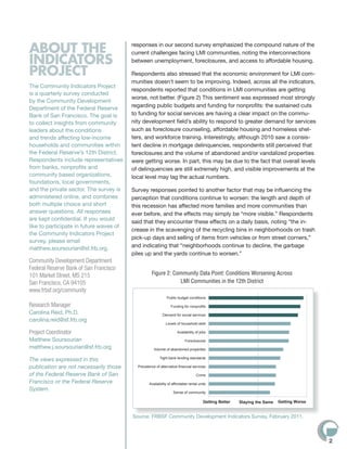 The February 2011 Community Indicators survey found that unemployment remained the top challenge facing low- and moderate-income communities in the 12th district. 44% of respondents selected unemployment as the greatest challenge. Respondents also noted that conditions in these communities continued to worsen across indicators such as public funding, nonprofit funding, and housing market conditions. A key theme was the relationship between unemployment and rising foreclosures, as many families facing job losses were going into foreclosure due to inability to pay their mortgages. Respondents called for improved collaboration and targeted interventions to address economic challenges in different low-income communities.
