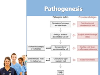 Ventilator-associated pneumonia (VAP) is a common nosocomial infection that increases ICU stay and mortality. The document discusses risk factors for VAP and strategies to prevent and diagnose it, including implementing a VAP bundle with elements like elevating the head of bed, daily sedation vacations, and oral care. It emphasizes the importance of staff education to properly implement prevention protocols and decrease VAP rates.