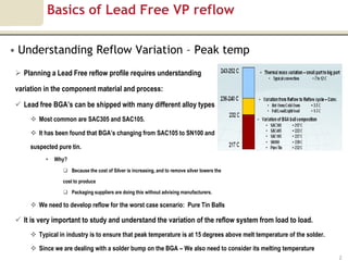 The document provides an overview of lead free vapor phase reflow soldering. It discusses the basics, including understanding component variation, recommended time and temperature profiles, and how vapor phase technology ensures temperatures remain within specifications. The history of vapor phase is summarized, followed by explanations of how it works and how it addresses past challenges like tombstoning and environmental concerns. Solutions are presented for automation, throughput and maintaining consistent low temperatures compared to convection.