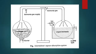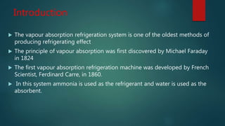 The document discusses the history and principles of vapor absorption refrigeration systems. Some key points: