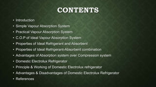 The document discusses vapour absorption refrigeration systems. It describes a simple vapour absorption system using ammonia and water, and a practical system. It defines the coefficient of performance (COP) of an ideal absorption system and lists properties desired in ideal refrigerants and absorbents. The document also discusses the domestic Electrolux refrigerator, which uses ammonia, hydrogen and water, and operates entirely through gravity flow without pumps. Key advantages of absorption systems over compression include having no moving parts and ability to operate on thermal energy alone.