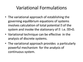 The document discusses the variational formulation and Rayleigh-Ritz method for solving systems. The variational approach involves calculating the total potential of a system and finding the stationary value where the potential is zero. The Rayleigh-Ritz method assumes the form of the unknown solution in terms of known trial functions with adjustable parameters. The functional is expressed in terms of these parameters and differentiated to obtain equations that are set to zero to solve for the parameters.