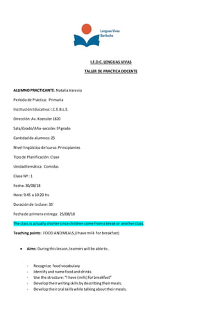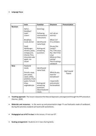 The document provides a lesson plan for a 35-minute English class for 5th graders focusing on food vocabulary. The plan includes aims, language focus, teaching approach, materials, seating arrangement, activities and assessment. The lesson begins with a warm-up reviewing breakfast, lunch and dinner vocabulary. Students then practice the target structure "I have (milk) for breakfast" and describe their own meals. The class concludes with students pasting their work in their folders.