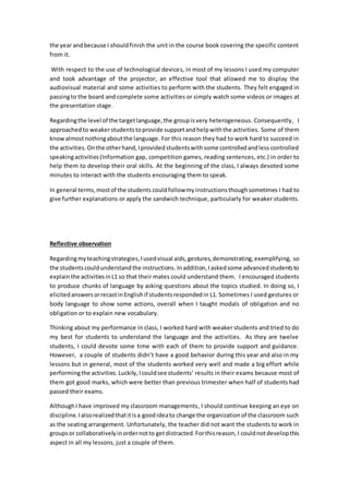 Natalia Vareseo completed her secondary practicum teaching English to 13-year old students in Argentina. She faced the challenge of a heterogeneous class level, from students with no English knowledge to those attending private institutes. Natalia reflected on using visual aids, videos and hands-on activities to engage students at different levels. She worked to improve her classroom management and timing. Overall, the experience helped Natalia gain confidence in teaching adolescents and she learned the importance of adapting lessons to meet students' needs.
