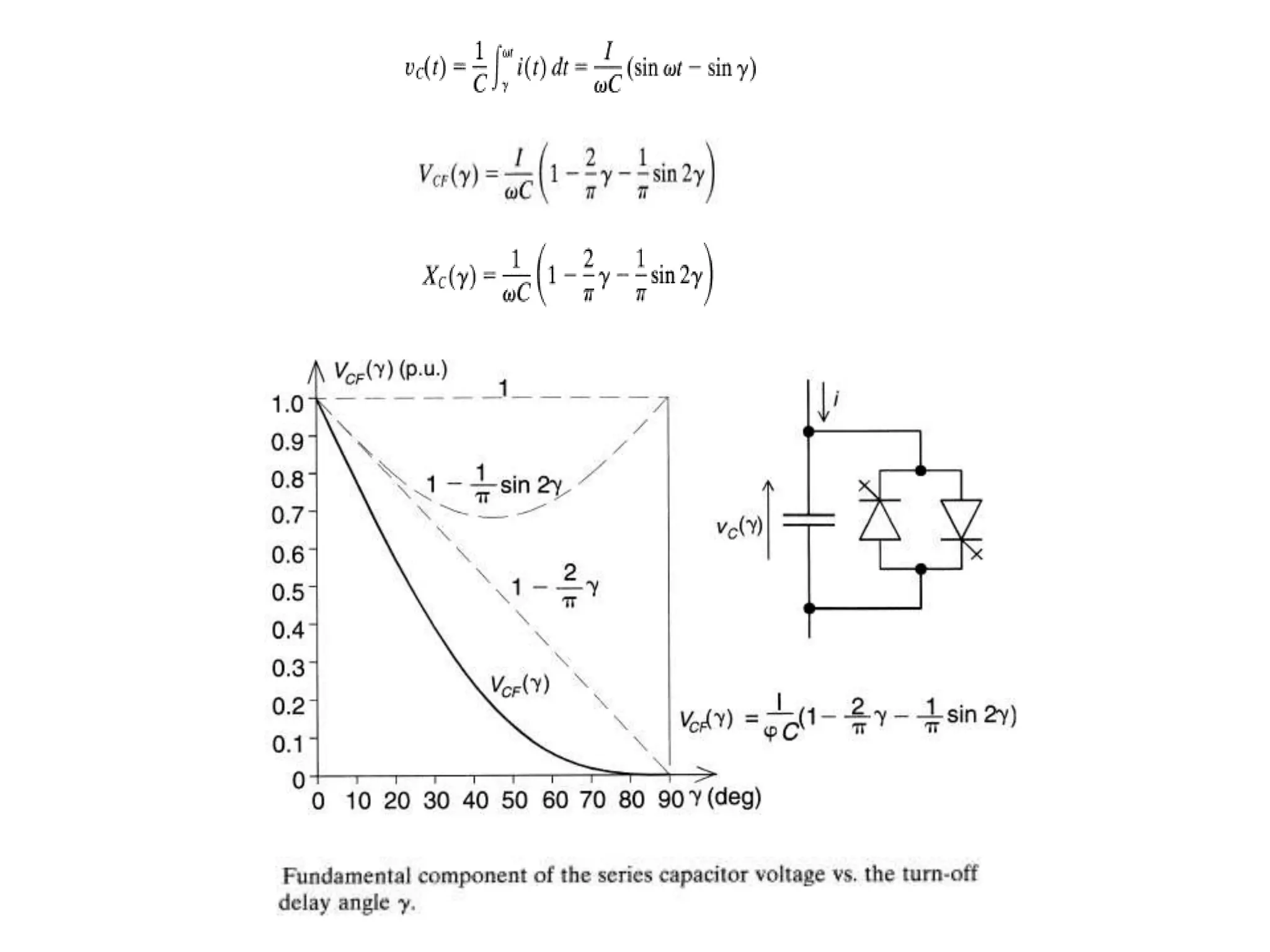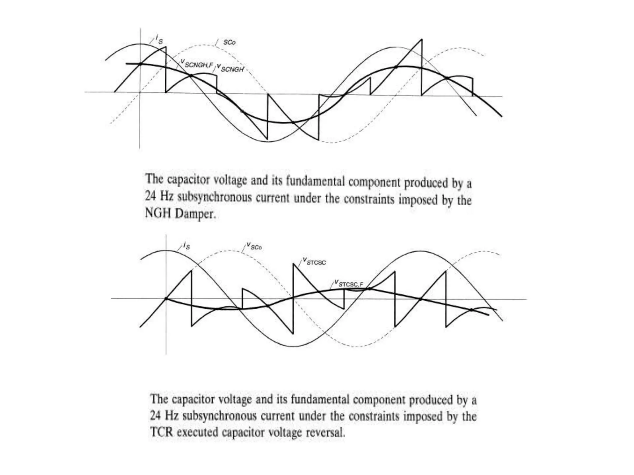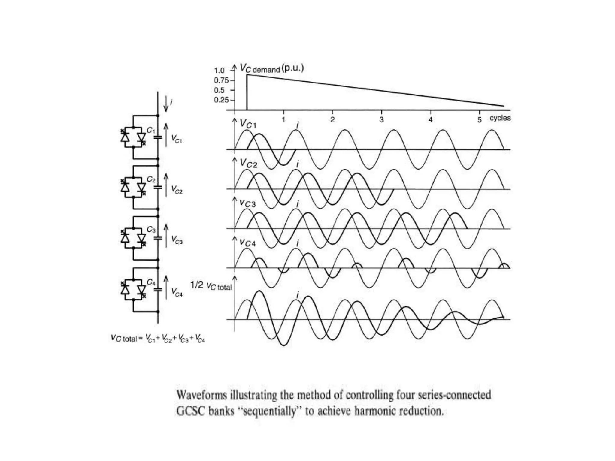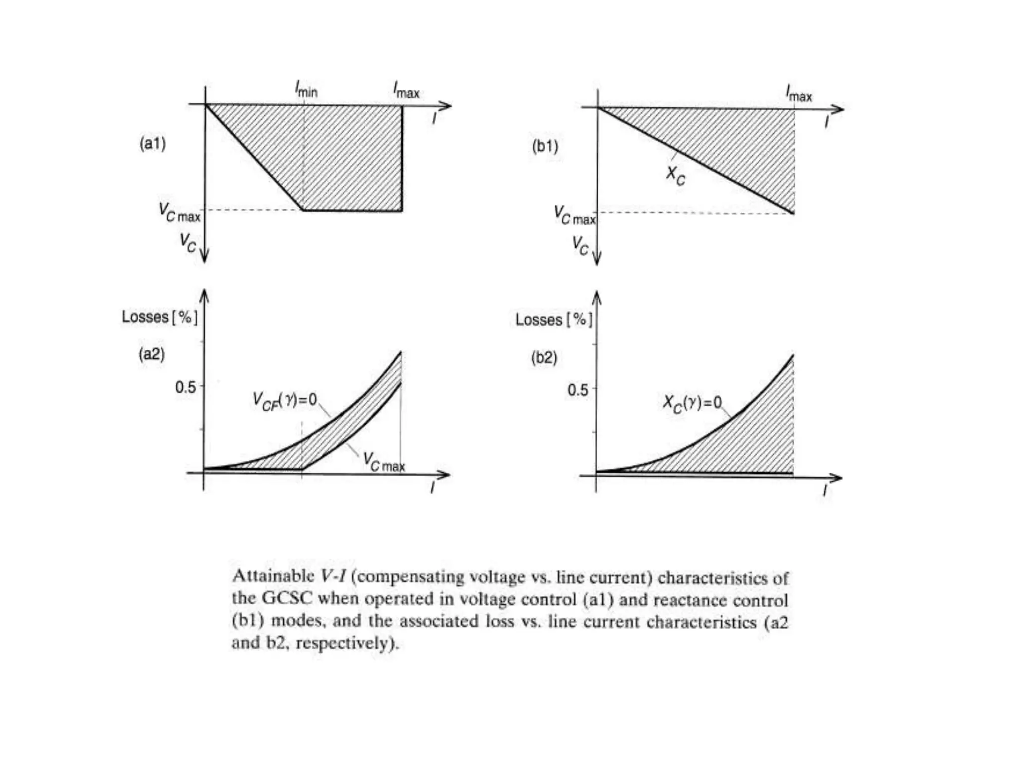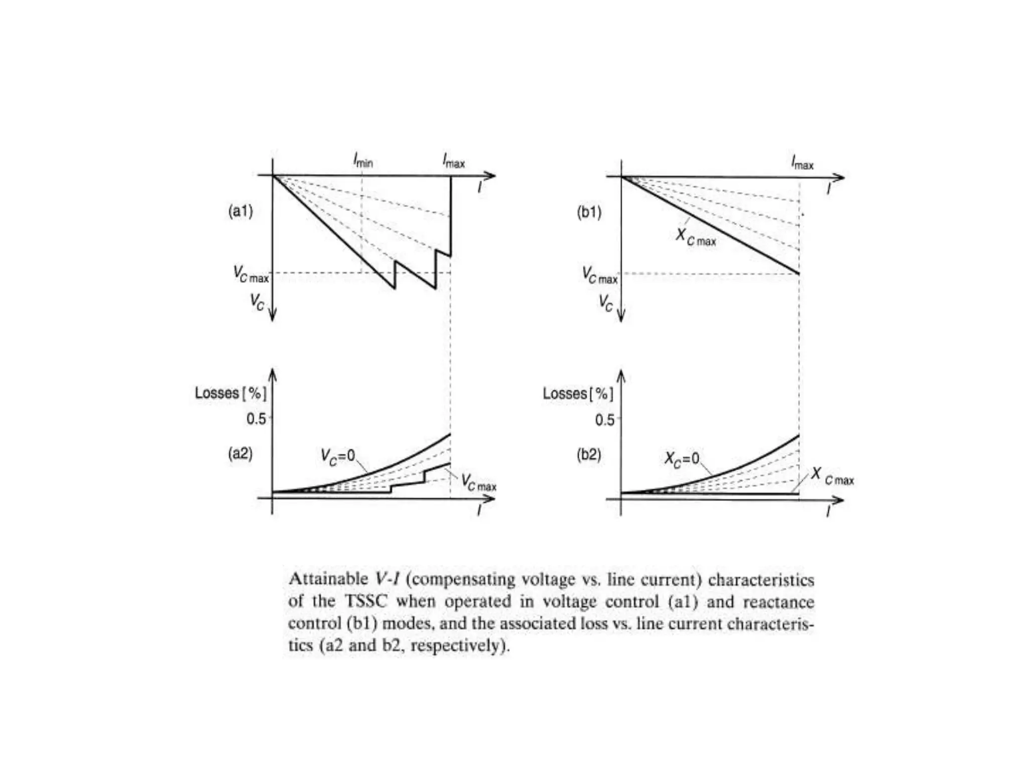 This document discusses two types of variable impedance series compensators: the thyristor-controlled series capacitor (GCSC) and the thyristor-switched series capacitor (TSSC). It explains that the GCSC uses thyristors to control the voltage developed across a fixed capacitor, creating a variable reactive impedance. The TSSC uses thyristors to control the current in a fixed inductor from a constant voltage source, creating a variable reactive admittance. It also covers the operating control schemes for each device and discusses the phenomenon of sub-synchronous resonance.