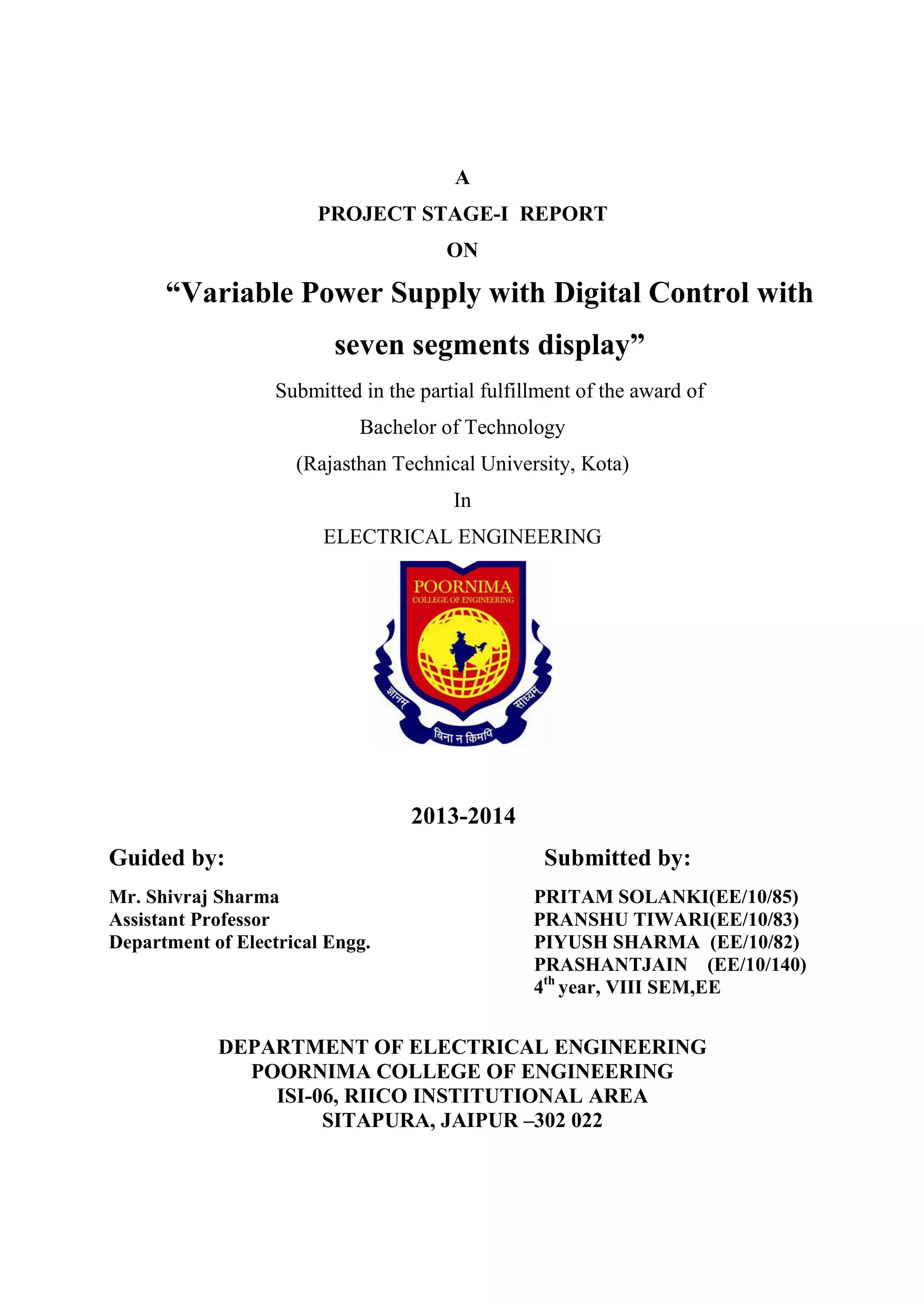 The document presents a project report on a variable power supply with digital control and seven segments display, submitted as part of a Bachelor's degree in Electrical Engineering. It describes the design and functioning of the circuit built around various ICs for providing a stable and adjustable power output, emphasizing its practical importance in electronic workshops. The report includes components, circuit diagrams, and explanations aimed at facilitating an improved educational experience for students in technology.