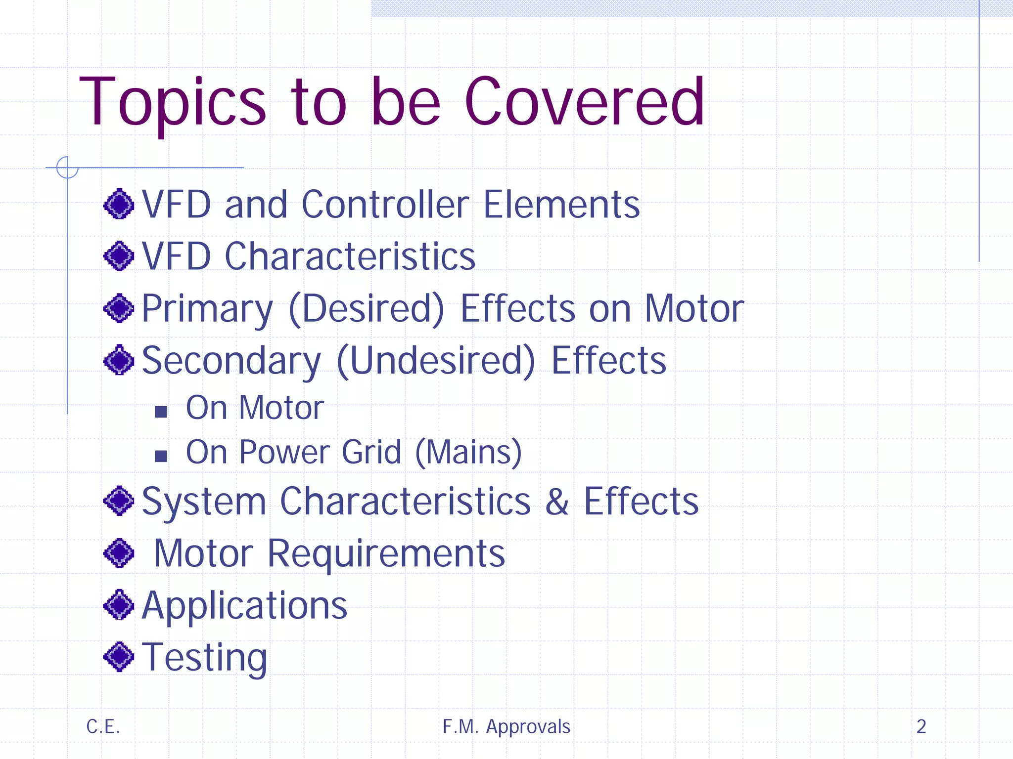 This document discusses variable speed fire pump controllers. It covers the components and operation of variable frequency drives (VFDs) and the requirements for a fire pump controller system using a VFD. Key points include an overview of VFD elements and operation, requirements for the controller system including isolation contactors and pressure monitoring, considerations for motor starting characteristics and coordination, and design factors such as cooling and pollution rating. Application-specific topics like hydraulic system tuning are also addressed.