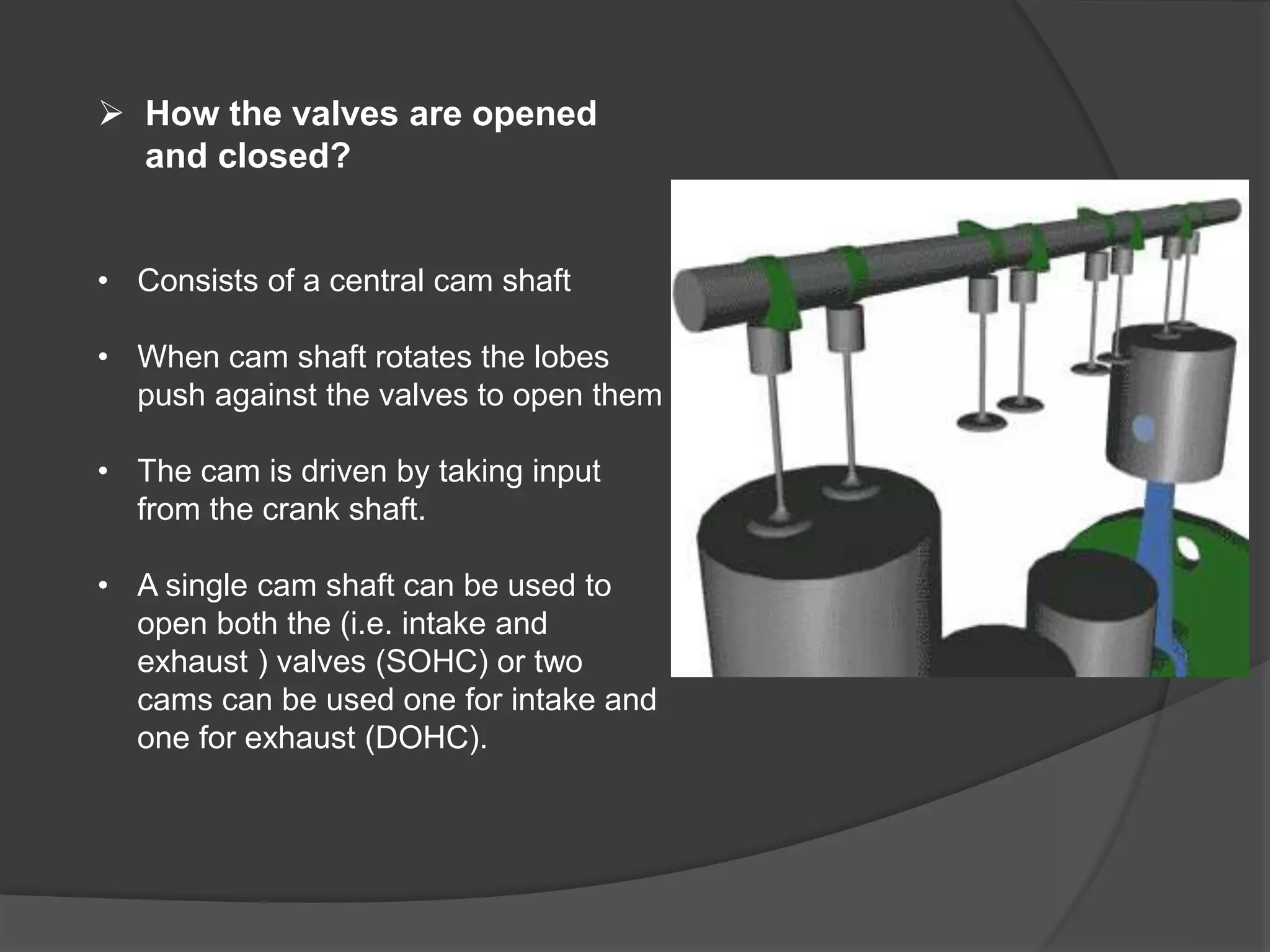 Variable valve timing allows the valve opening and closing points to be adjusted based on engine speed and load conditions. This improves engine performance and fuel economy over a fixed valve timing system. Variable valve timing is achieved through advance/retard systems that adjust the cam shaft timing using a movable tensioner controlled by the engine control module. Another method uses multiple cam profiles activated by oil pressure to vary the valve lift and duration. Variable valve timing provides benefits like better fuel efficiency, torque, and emissions but at a higher cost and complexity over a standard cam shaft setup.